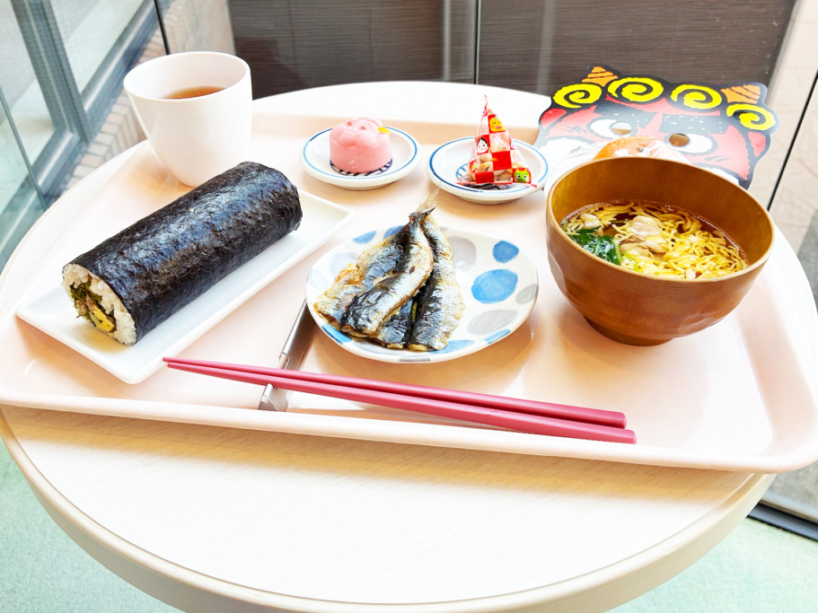 今年の恵方「北北西」を向いていただく大きな恵方巻、ふっくらと炊き上げたいわし、大豆を添えた、節分の主役たちが並ぶ、見た目にも賑やかな特別メニューです。